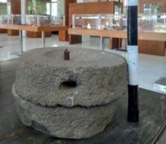 Gilingan berbahan batu adesit ini memiliki betuk bulat serta sedikit menyudut pada bagain atas, terdiri dari dua buah batu bulat ditumpuk. Bagian batu bulat atas memiliki cerukan dan disalah satu sudut ceruk terdapat lobang serta besi berbentuk silinder yang difungsikan sebagai poros putar. Pada salah satu sudut sisi samping batu bagian atas terdapat lubang untuk jalur keluarnya hasil gilingan Sedangkan batu bulat sisi bawah sebagai landasan memiliki pola dan tekstur bagian atas garis bergerigi. Batu bagian bawah ini memiliki ukuran sama dengan bagian atas