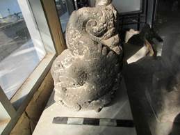 Berbentuk kepala hewan mitologi dengan mulut berbelalai menganga ke atas. Di atas dan di belakang kepala dihias motif sulur. Pada sisi depan, di bawah sulur dan seolah-olah di dalam mulut berbelalai terdapat Kinnari. Di atas kepala Kinnari ada hiasan memanjang hingga ke atas, berhias bunga teratai yang mekar. Keadaan aus. Bagian belakang sebagai media kuncian telah patah.